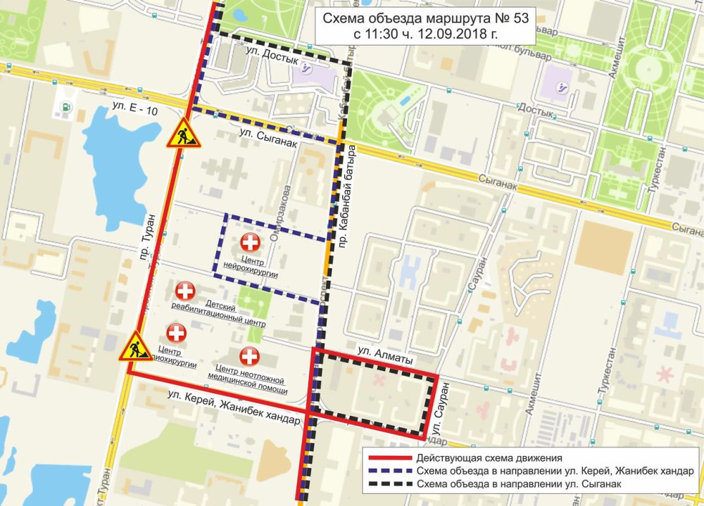 Маршрут № 53 – от начального остановочного пункта "Рынок "Шарын" до пересечения улицы Сыганак – проспект Туран без изменения, далее – налево на улицу Сыганак, направо на проспект Кабанбай батыра с заездом в район медицинских учреждений, далее – согласно действующей схеме движения.