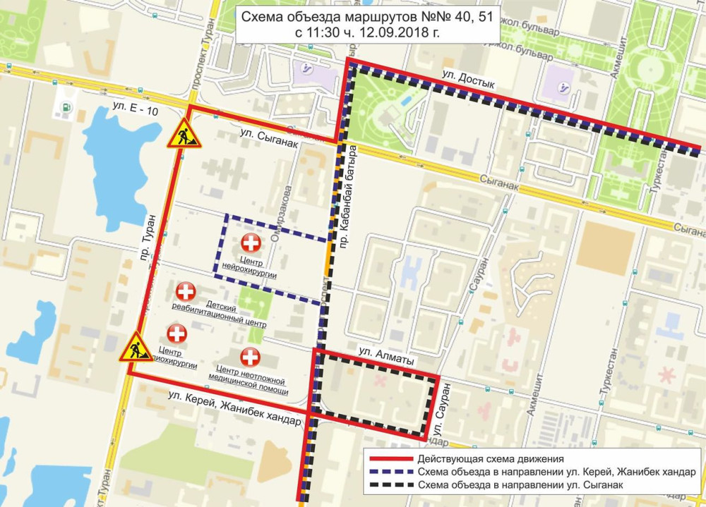 Маршрут № 40 – от начального остановочного пункта "Железнодорожный вокзал" до пересечения улиц Сыганак – проспект Кабанбай батыра без изменения, далее – прямо по проспекту Кабанбай батыра с заездом в район медицинских учреждений, затем – согласно действующей схеме движения.