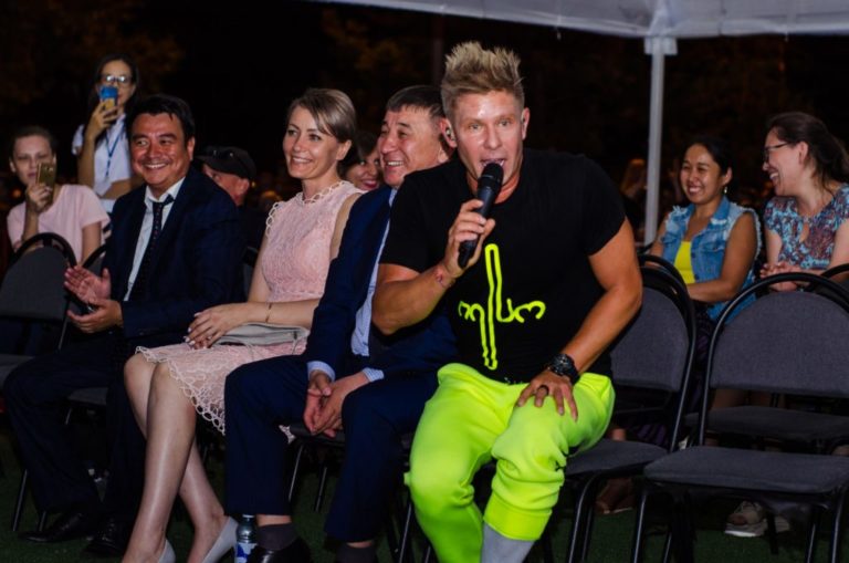 Митя Фомин подходил и к палатке, где сидели специальные гости и аким города Кайрат Ахметов. Артист как раз исполнял песню "Все будет хорошо" и дал пропеть припев акиму.