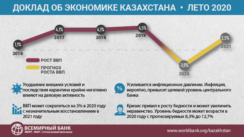Всемирный Банк опубликовал доклад об экономике Казахстана, передает BaigeNews.kz. Согласно данным, экономические последствия COVID-19 стали крупнейшими для экономики Казахстана за последние почти два десятилетия и уже оказывают существенное негативное влияние на ее рост.