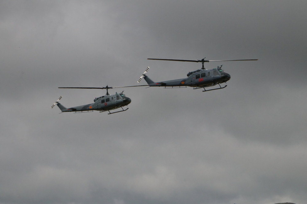 Также в боевом параде для десантирования посадочным способом и с использованием специального оборудования задействованы вертолеты МИ-17, Хьюи - американский многоцелевой вертолёт фирмы Bell Helicopter Textron, Е-145 - Еврокоптер, а для нанесения ракетных ударов – МИ-35.