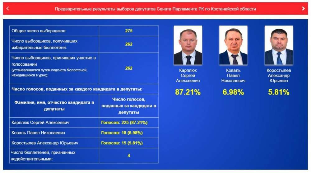 По предварительным данным, в Костанайской области лидирует Сергей Карплюк. В голосовании приняли участие 262 человека.