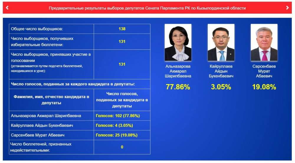 В Кызылординской области по предварительным данным, лидирует Акмарал Альназарова. В голосовании приняли участие 131 человек.