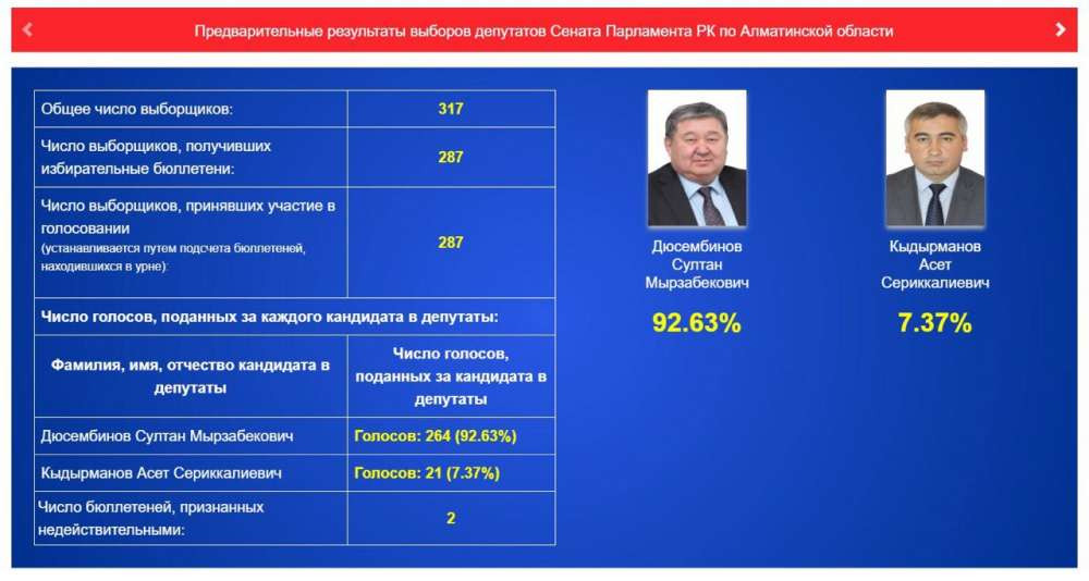 Предварительные данные в Алматинской области: лидирует Султан Дюсембинов.