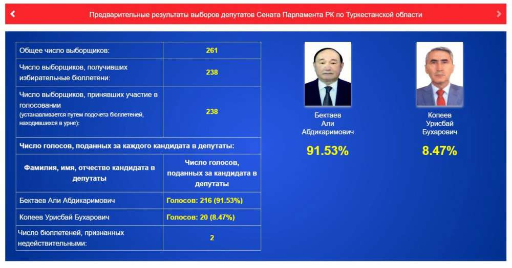 В Туркестанской области в голосовании приняли участие 238 выборщиков. По предварительным подсчетам, Али Бектаев набрал порядка 91 процента голосов.