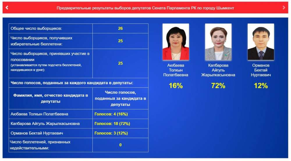 В Шымкенте приняли участие в голосовании 25 человек. Среди кандидатов, по предварительным данным, пока лидирует Айгуль Капбарова, с результатом в 72 процента.