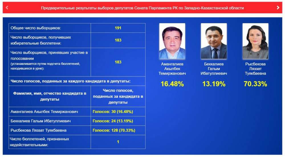В ЗКО, по предварительным данным, лидирует Ляззат Рысбекова.