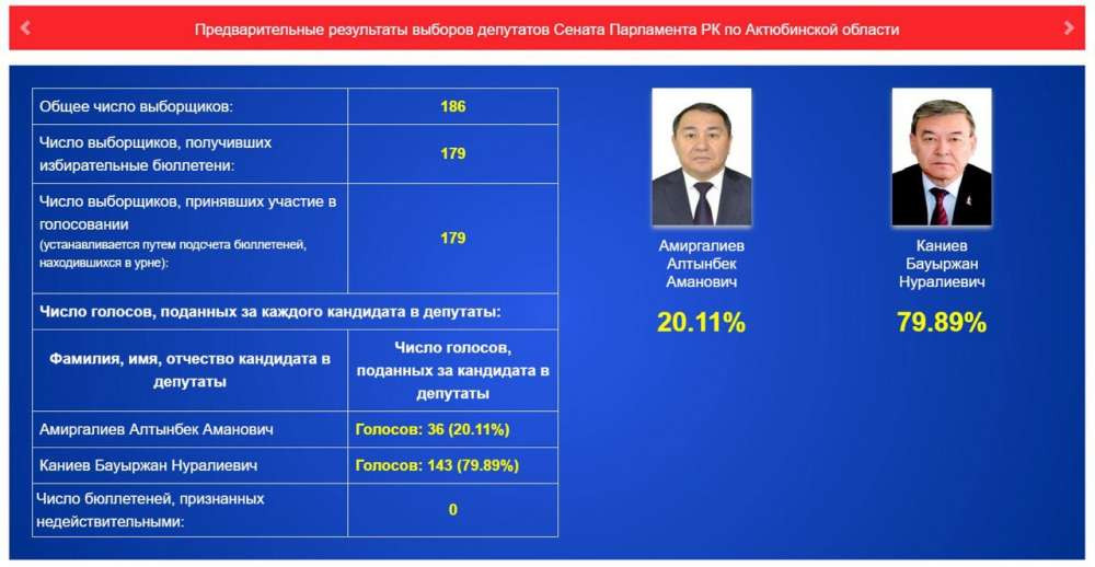 В Актюбинской области в голосовании приняли участие 179 выборщиков. По предварительным подсчетам, лидирует Бауыржан Каниев.