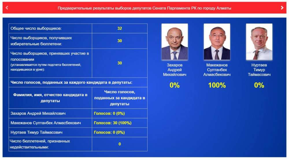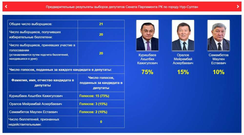 Предварительные результаты выборов депутатов Сената по Нур-Султану выглядят так: