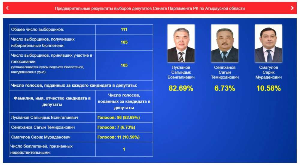 Также предварительные результаты огласили и по Атырауской области. Там лидирует Сагындык Лукпанов.