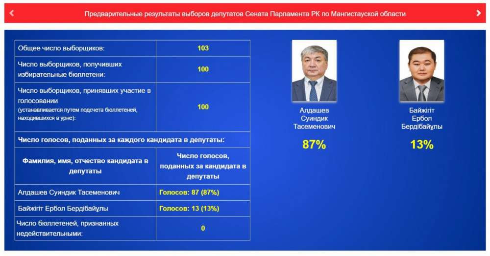 В Мангистауской области, по предварительной информации, на первом месте находится кандидат в депутаты Сената Суиндик Алдашев.