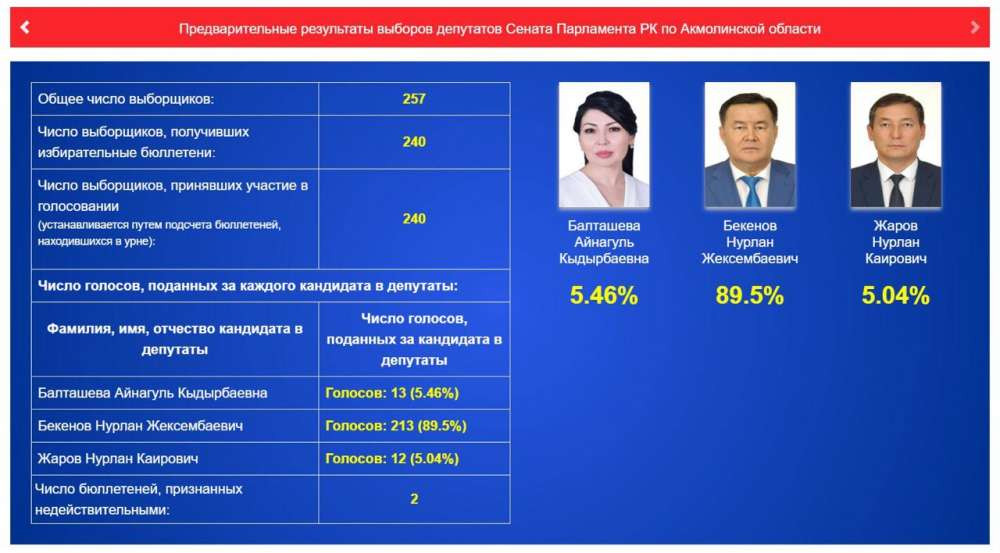 В Акмолинской области, по предварительной информации, на первом месте находится кандидат в депутаты Сената Нурлан Бекенов.
