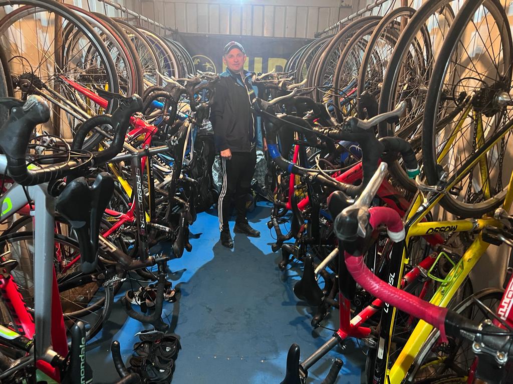 Старший тренер отделения демонстрирует велобазу. Причём часть велосипедов не числится в школе – куплена кем-то, передана федерацией и так далее.
