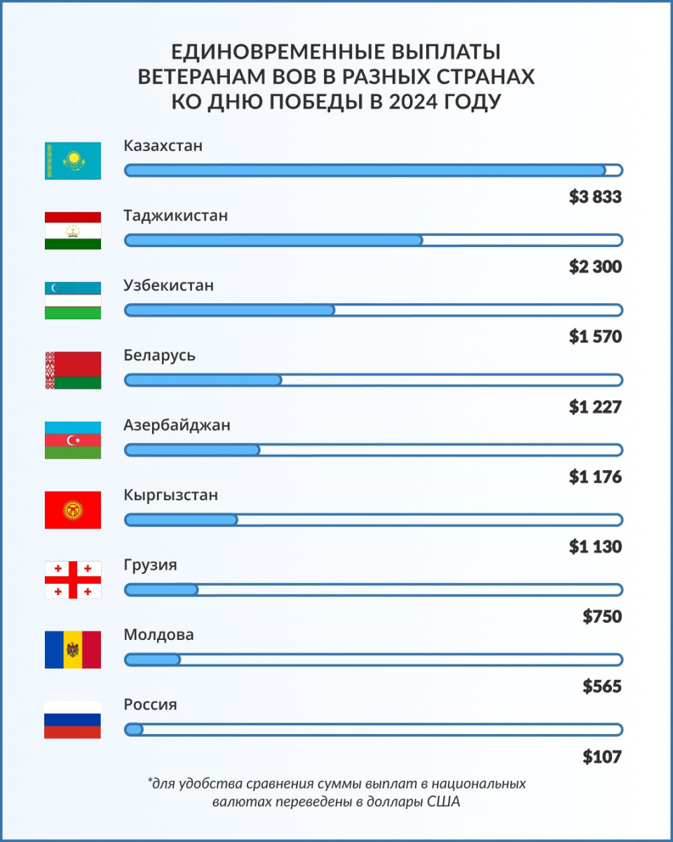 В Таджикистане проживают 24 ветерана ВОВ, выплата им составила по 2,2-2,3 тысячи долларов. В Узбекистане – 1,5 тысячи долларов. В Беларуси 1,1 тысячи ветеранов получили по 1,2 тысячи долларов, в Азербайджане и Кыргызстане – по 1,1 тысячи долларов. Меньше всего предусмотрено на эти цели в России. Там 12,5 тысячи ветеранов получили по 107 долларов.