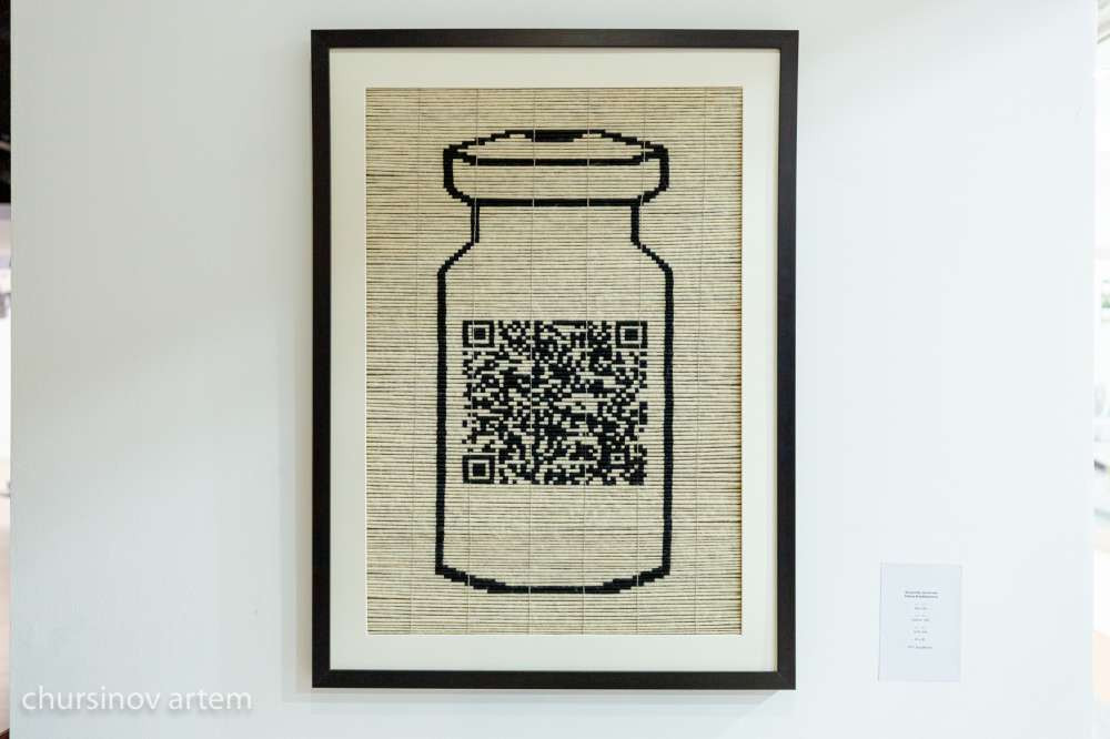 Художница отмечает, что несмотря на то, что работа выполнена в национальной традиционной технике, она все равно говорит на современном языке. Здесь изображен флакон, это вакцина Спутник V и на ней изображен QR-код. Он, кстати, рабочий и переходит на YouTube-ссылку, где можно послушать первый искусственный спутник Земли — Спутник-1.