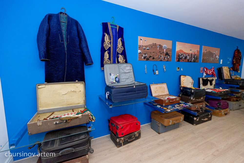 Художник Асхат Ахмедьяров разместил анонс в соцсетях, что собирает чемоданы, чтобы показать с каким багажом люди хотели бы уехать на Марс. Здесь собраны чемоданы разных людей, которые откликнулись и принесли их художнику. Дополняет его инсталляцию серия коллажей "Прибытие", которую сделала наша молодая художница Айдана Кулахметова.