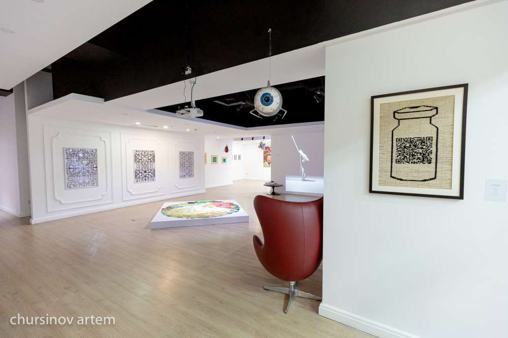 Сверху на посетителей смотрят зрачки в форме спутников. Это работа российского художника Димы Вирже "Спутник". Вообще же, в течении всей экскурсии мы не раз услышим это слово в названиях и в монологах художников.