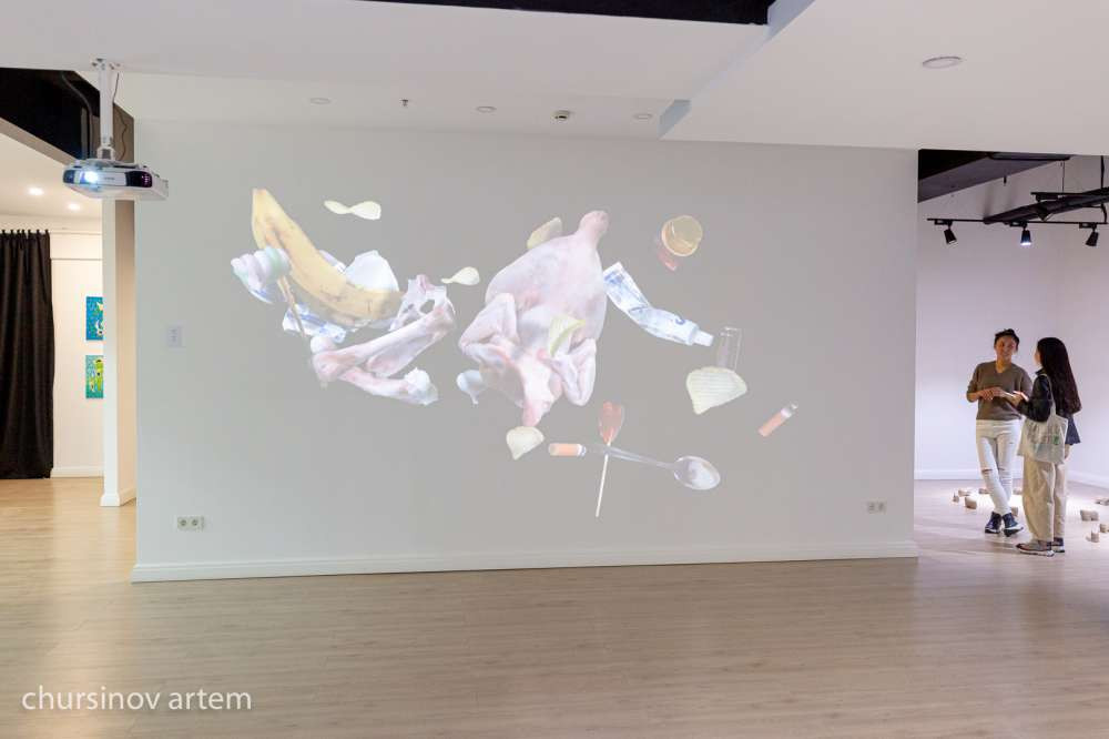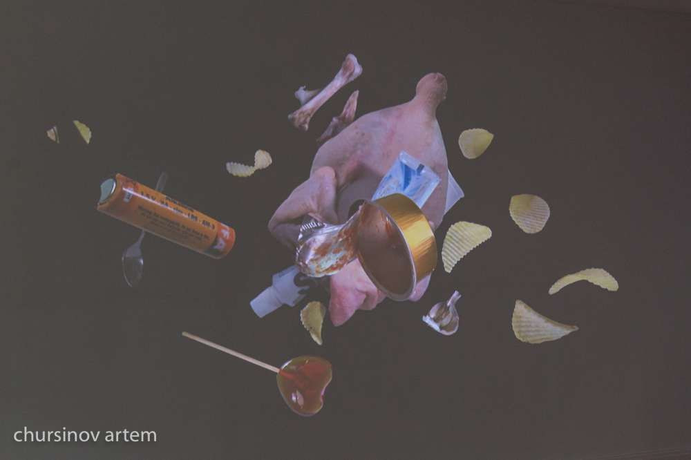 Напротив этого видеоряда расположена работа швейцарского художника Петара Эшмана. Работа называется "Спутник" и она повествует о том, что бы мы оставили космос от нашей планеты, если бы произошел большой взрыв. Перспективы нерадужные, художник весьма пессимистично видит возможный след землян. В невесомости космоса летают какие-то бычки, чипсы, огрызки яблок, замороженная курица.