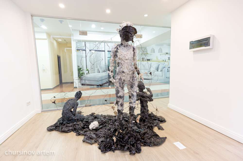 Рядом расположена работа молодого художника из Казахстана Абылая Мурашбекова "Субъекты в пространстве". Художник сейчас заканчивает КазНУИ и делает свою дипломную работу. Его работа — это размышление про взаимосвязь с людьми, здесь визуально показаны его внутренние переживания. Работа метафизична, а фигура в центре чем-то напоминает космонавта в скафандре. Фигуры инсталляции находятся в некоей черной материи — то ли в космосе, то ли в подсознании человека.