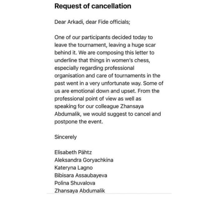 К посту шахматистка приложила коллективное письмо в адрес руководства ФИДЕ и ответ Аркадия Дворковича, в котором он признаёт, что организаторы турнира в Индии оказались неподготовленными.
