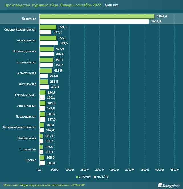 За январь–сентябрь 2022 года производство яиц в РК составило 3,8 млрд штук — на 5,3 процента больше, чем годом ранее.