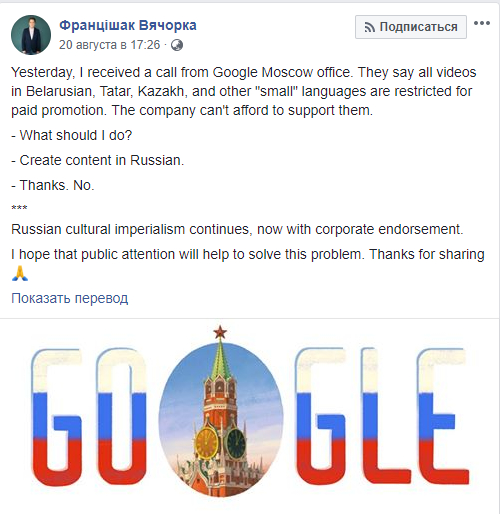 "Вчера я получил звонок из офиса Google Moscow. Говорят, что все видео на белорусском, татарском, казахском и других "малых" языках ограничены для платного продвижения. Компания не может позволить себе их поддерживать", — написал в своем посте Вечерко.