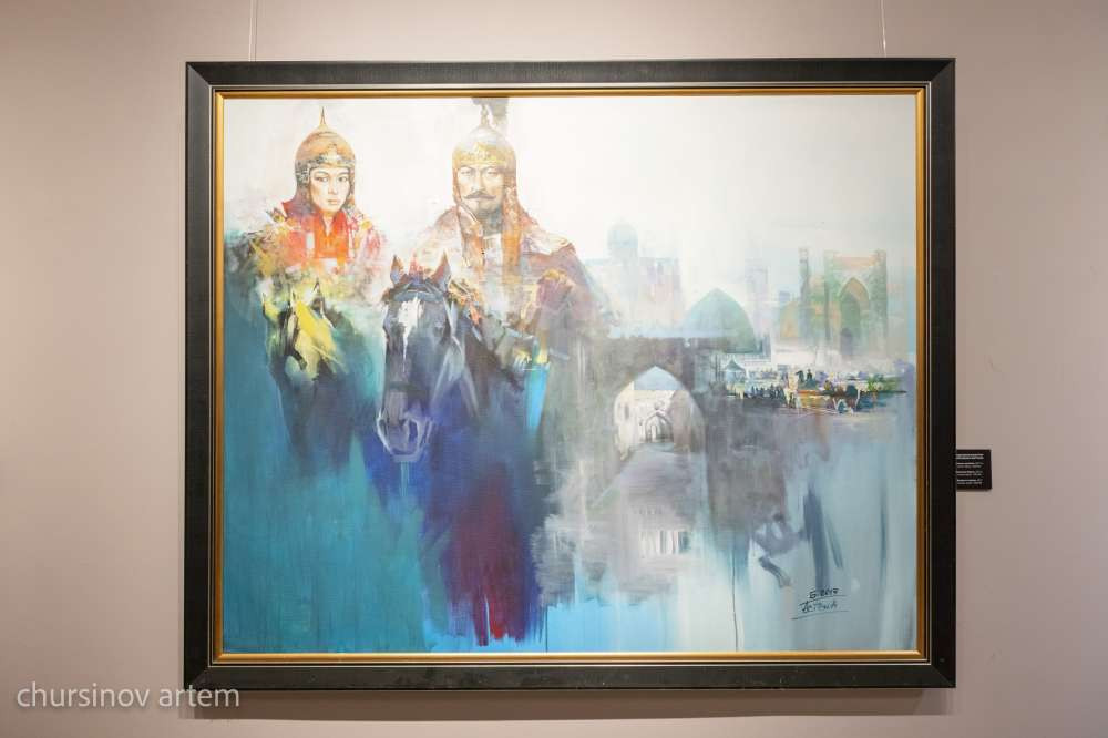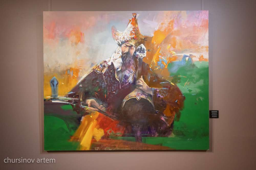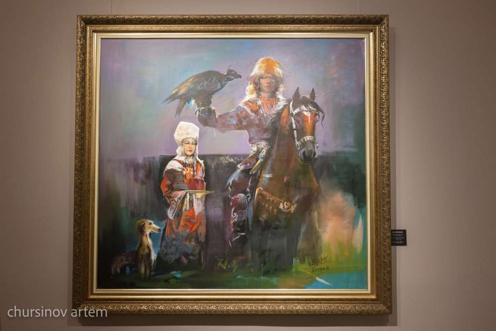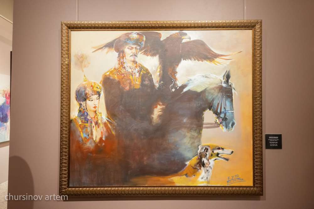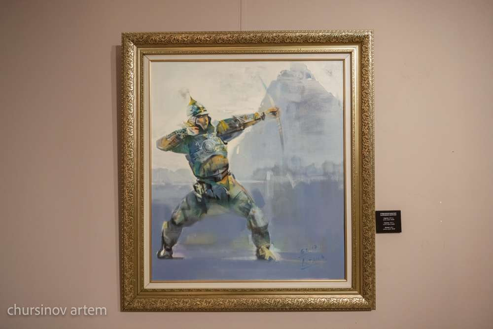 В следующей части экспозиции представлены работы, посвящённые батырам. То есть здесь мы видим исторические мотивы, которые интересны художнику. К примеру, можно здесь увидеть изображение батыра в полной боевой амуниции.