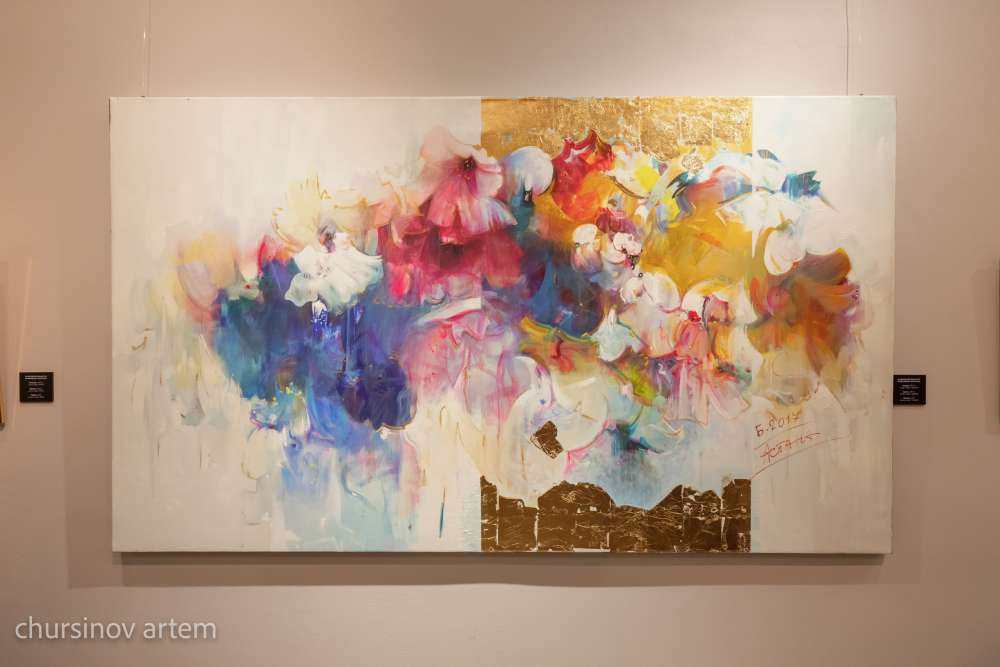 Ещё одна работа, представленная на выставке, называется "Цветы". Крупными, уверенными мазками создаются силуэты благоухающих, ярких цветов. Интересной деталью здесь является золотая патина, которая здесь добавлена как цветовой акцент.