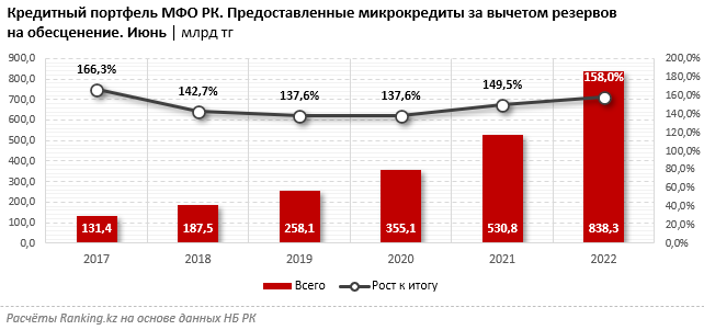 В целом рынок микрофинансовых организаций демонстрирует динамичный рост объёмов займов из года в год, внося существенный вклад в развитие кредитного рынка РК. Так, к концу первого полугодия текущего года кредитный портфель МФО РК увеличился на 58 процентов до 838,3 миллиарда тенге.