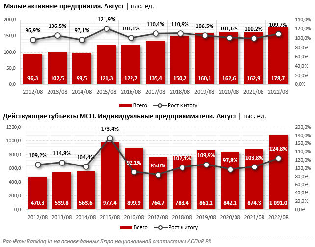 При этом в Казахстане, несмотря на рост числа активных малых предприятий, сектор МСБ всё ещё не получает должного развития. Так, на конец августа текущего года в стране насчитывается 178,7 тысячи малых активных предприятий — на 9,7 процента больше, чем в аналогичном периоде прошлого года.