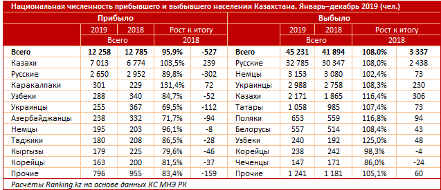 В национальном разрезе наибольшее количество прибывших в страну — казахи (7 тыс.); кроме того, прибыло 2,65 тысяч русских и 301 каракалпак.