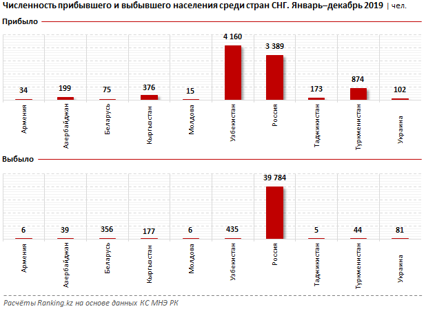 Выбыли из Казахстана в основном в Российскую Федерацию (39,8 тысячи человек), Узбекистан (435 человек) и Беларусь (356 человек).