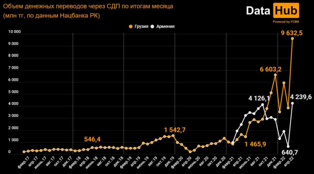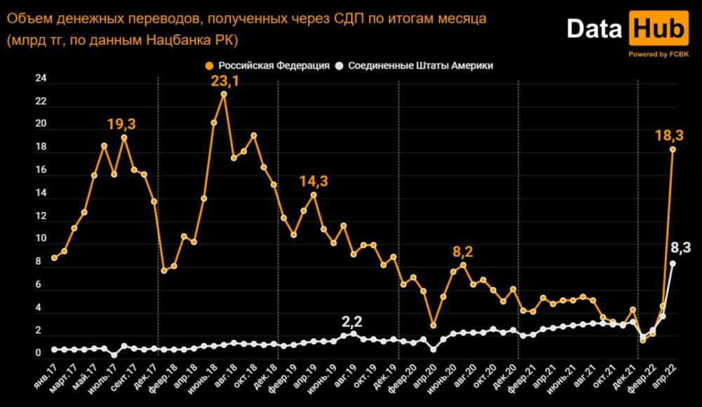 "В первую очередь обращает на себя четырёхкратный рост переводов из России – с 4,6 миллиарда тенге в марте до 18,3 миллиарда тенге в апреле. Это максимальный объем с июля 2018 года. За предыдущие полгода (с октября 2021-го по март 2022 года) из России через СДП пришло 18,8 миллиарда тенге. А тут практически столько же за один месяц", - отмечают аналитики ПКБ.