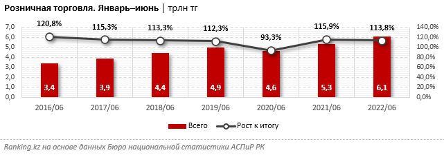 По итогам первого полугодия объём розничной торговли достиг 6,1 триллиона тенге — на 13,8 процента больше в деньгах, чем годом ранее. Реальный рост физического объёма торговли составил всего 1,2 процента, сообщает