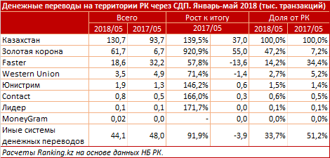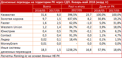 Среди систем переводов продолжает лидировать "Золотая корона" - 9,7 млрд тенге, объём за год вырос в 6,4 раза. Доля системы выросла с 19,2% до 30,8%.
