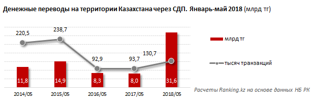 Денежные переводы на территории РК через СДП в текущем году пользуются большой популярностью. Их объём вырос почти в 4 раза, и составил за январь-май 31,6 млрд тенге по сравнению с аналогичным периодом прошлого года. До этого 2 года подряд их объём снижался, передаёт BNews.kz со ссылкой на ranking.kz.
