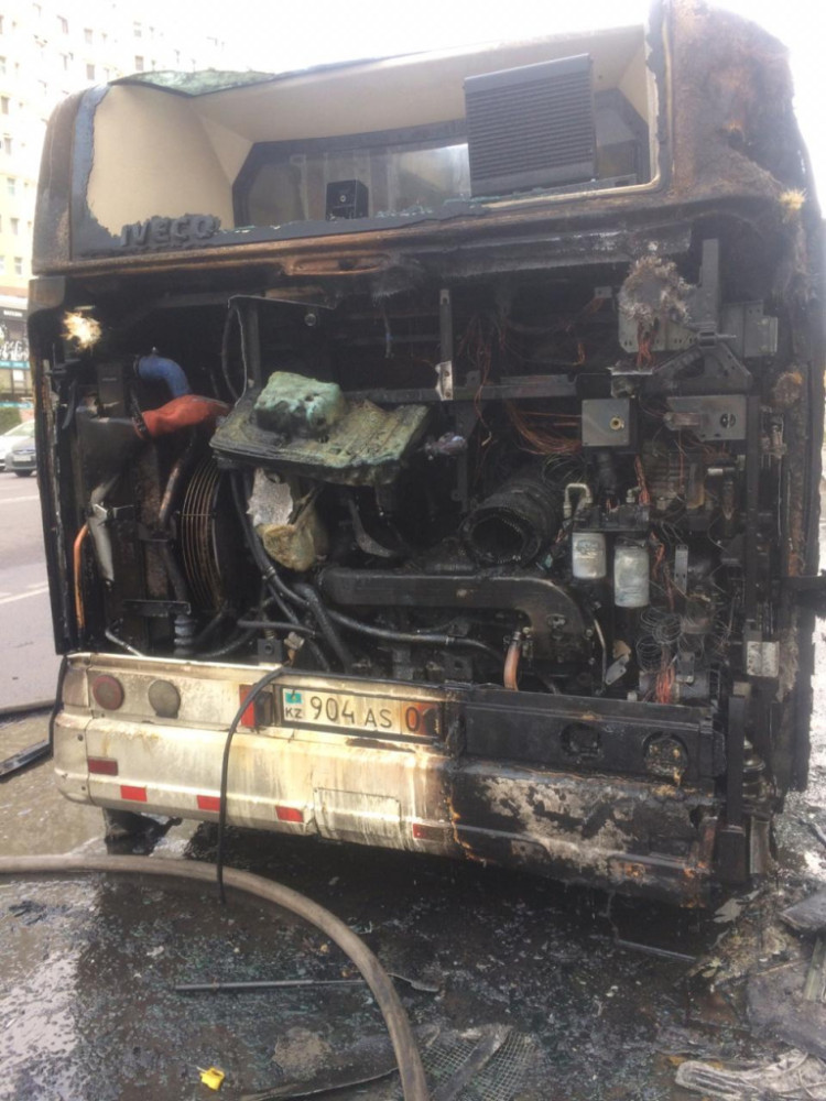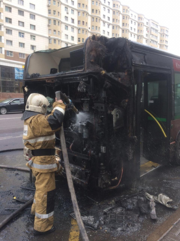 Сообщается, что 24 октября в 09:17 на пульт "101" Нур-Султана поступило сообщение о возгорании пассажирского автобуса на пересечении улиц Б.Момышулы и Сатпаева. По прибытии первых пожарных расчетов в 09:21 горел двигательный отсек и задняя часть автобуса. Пассажиров в салоне не было.