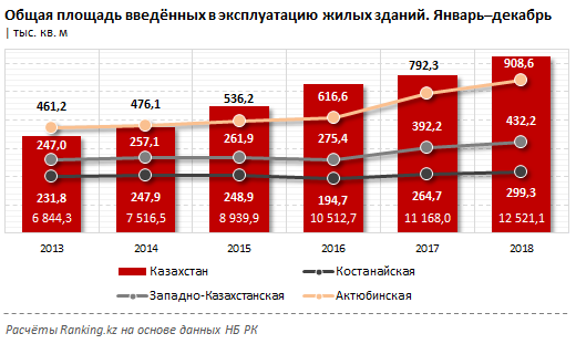 В Костанайской и Актюбинской областях ввод жилья также на подъёме, как и в целом по РК. Так, за 2018 год в Костанайской области сдали в эксплуатацию 299,3 тыс. кв. м, против 264,7 тыс. кв. м годом ранее и 247,9 тыс. кв. м. — в 2014 году. В Актюбинской области ввод жилья по итогам прошлого года составил 908,6 тыс. кв. м, против 792,3 тыс. кв. м в 2017-м и 476,1 тыс. кв. м. — в 2014-м.