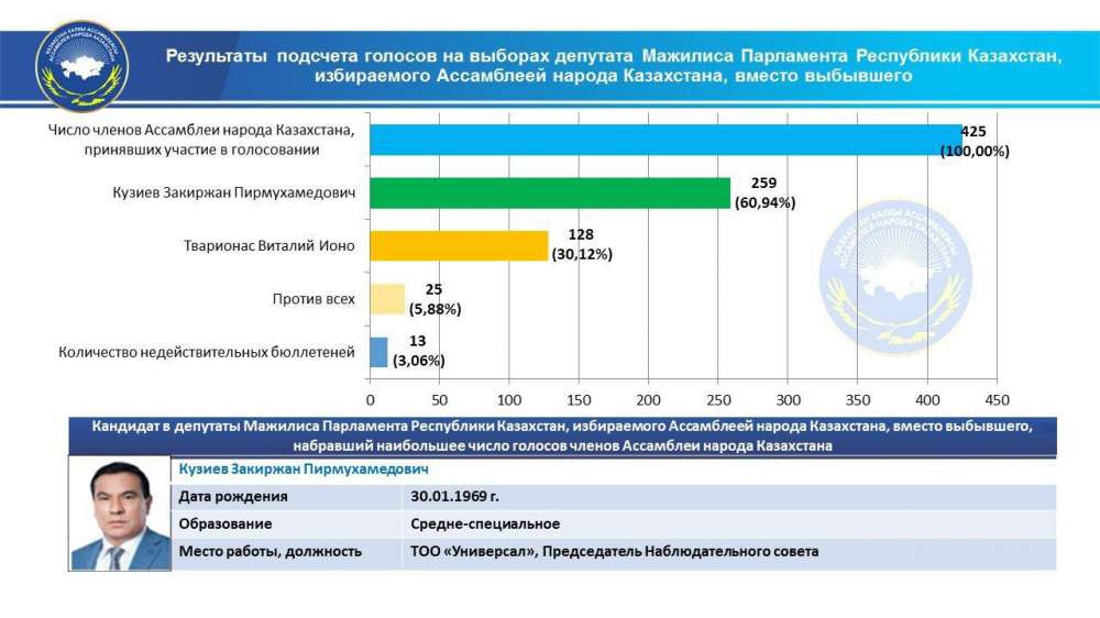 "Кандидат в депутаты Мажилиса парламента Республики Казахстан, избираемого АНК, вместо выбывшего, набравший наибольшее число голосов членов АНК: Кузиев Закиржан Пирмухамедович", - говорится в сообщении на сайте Центральной избирательной комиссии Казахстана.