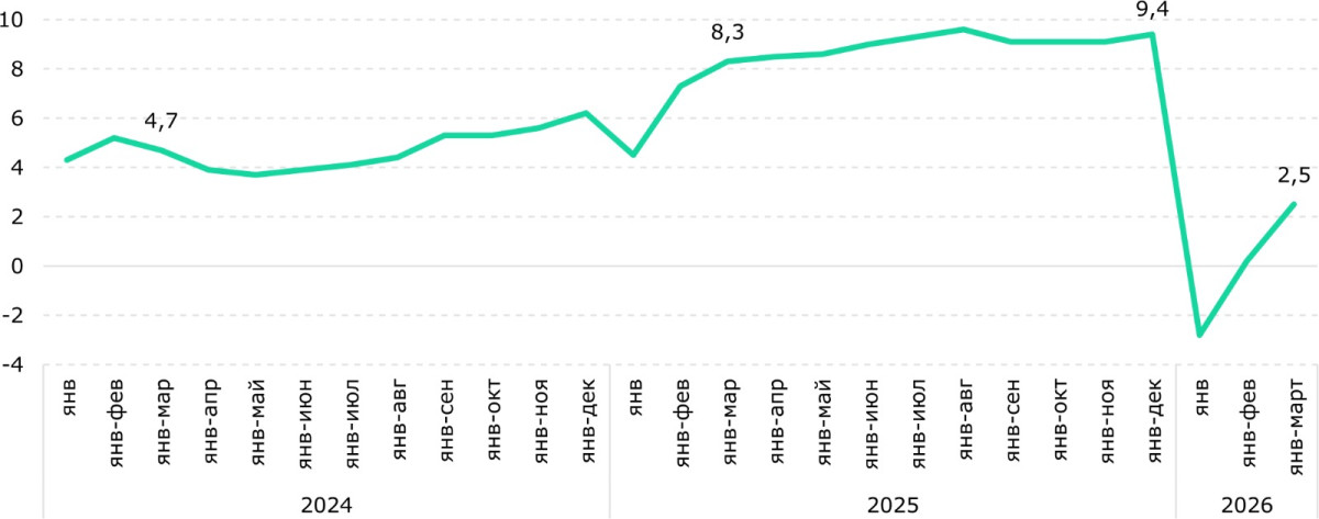 По итогам января-марта 2026 года рост ВВП Казахстана составил 3% в годовом выражении, сообщает корреспондент BAQ.KZ со ссылкой на Halykfinance.kz.