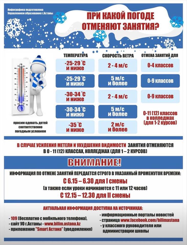 Аким также опубликовал инфографику с памяткой родителям о том, при каких погодных условиях отменяются занятия для школьников.