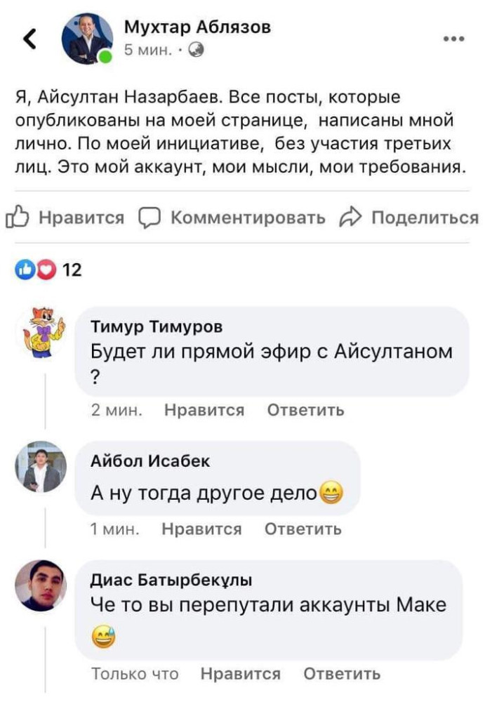 Комментаторы расценили этот инцидент как оплошность Аблязова, который попросту забыл перелогиниться и опубликовал пост, написанный от лица Айсултана Назарбаева, не на его странице, а на своей.
