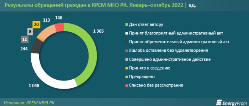 Только за январь — октябрь 2022 года в КРЕМ МНЭ РК поступили 4873 обращения — сразу на 36,2% больше, чем годом ранее. Из них принято 2247 заявлений, 687 жалоб, 55 предложений и 1884 обращения иного вида.