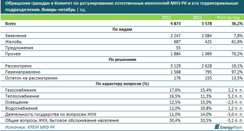 В частности, по итогам 10 месяцев текущего года 17,6% обращений казахстанцев касались вопросов газоснабжения, 16,5% — теплоснабжения, 12,5% — освещения, 12% — водоснабжения, 30,4% — общих вопросов ЖКХ и бытового обслуживания населения.