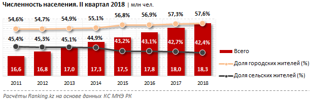 По итогам I полугодия в РК в городах проживает 10,5 млн человек - на 4% больше, чем годом ранее. Это уже 57,6% от всего населения РК против 57,3% год назад и всего 54,6% - в 2011 году, до принятия прогнозной схемы.