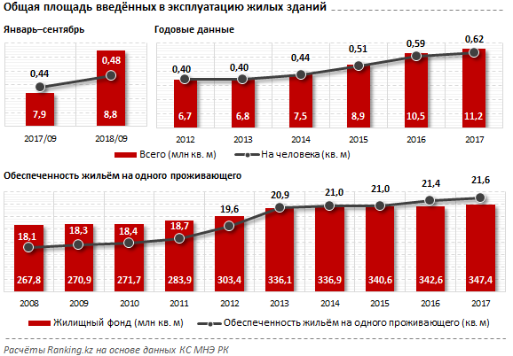 Опыт зарубежных стран показывает, что для кардинального улучшения жилищной обеспеченности в приемлемые сроки - на протяжении жизненного цикла одного поколения - строительная активность должна составлять около 1 кв. м на жителя в год. Между тем по итогам всего 2017 года ввод жилья на человека в РК составлял всего 0,62 кв. м, а в текущем году он предположительно будет немногим менее 0,7 кв. м, чего явно недостаточно для достижения стандартов ООН.