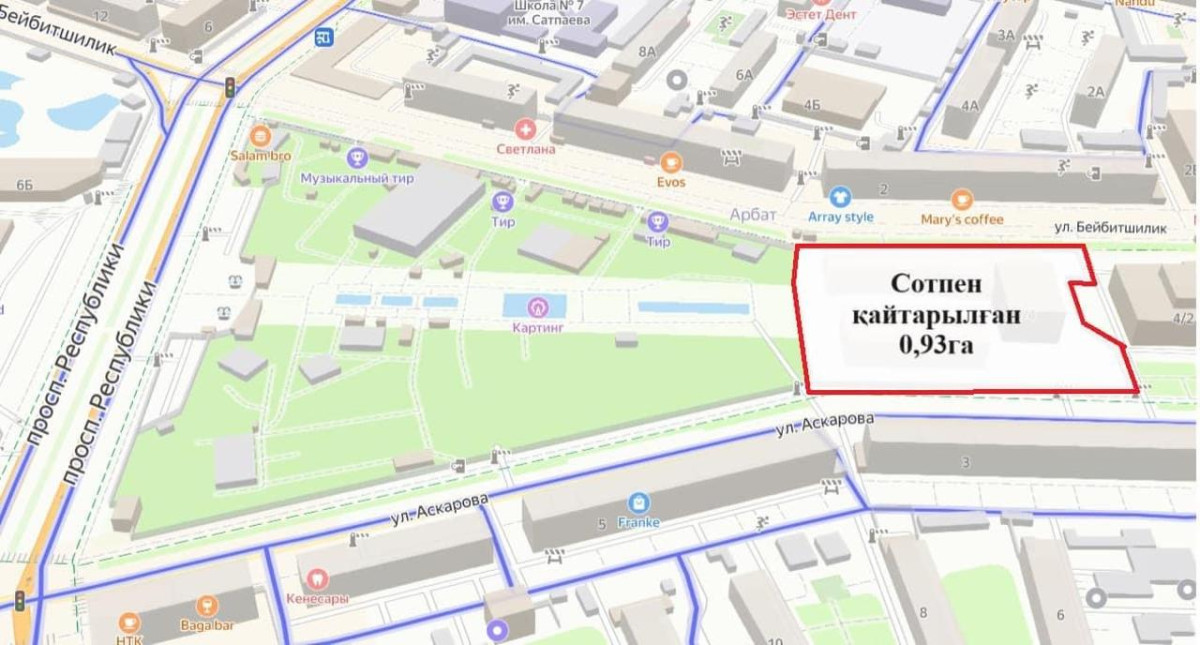 "Установлено, что земельный участок общего пользования площадью 0,9326 гектара, примыкающий к парку, предоставлен с грубейшими нарушениями земельного законодательства РК. На основании этого департаментом направлено исковое заявление в суд о признании правоустанавливающих документов недействительными. Решением суда от 4 июня требования департамента полностью удовлетворены", - сообщили в Комитете по управлению земельными ресурсами Минсельхоза.