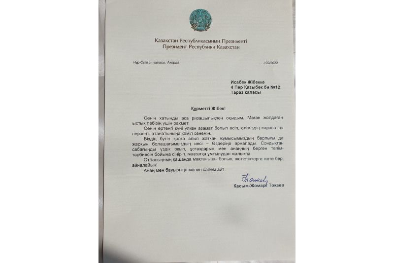 "Жибек – одна из лучших учениц этой сельской школы, у неё хорошая успеваемость. На днях она написала письмо с добрыми пожеланиями на имя Президента страны Касым-Жомарта Кемелевича Токаева. Её письмо попало в руки Главы государства", − рассказали в Региональной службе коммуникаций Жамбылской области.
