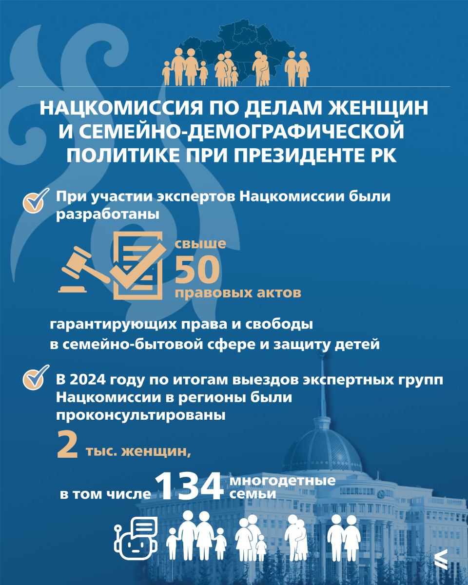 Свыше 50 правовых актов, гарантирующих защиту детей, а так же права и свободы в семейно-бытовой сфере приняли с участием экспертов Национальной комиссии по делам женщин и семейно-демографической политике при Президенте. Группы специалистов посещают регионы, анализируя проблемы, с которыми сталкиваются в обществе. За прошлый год поработать удалось с двумя тысячами женщин, в том числе из 134 многодетных семей.