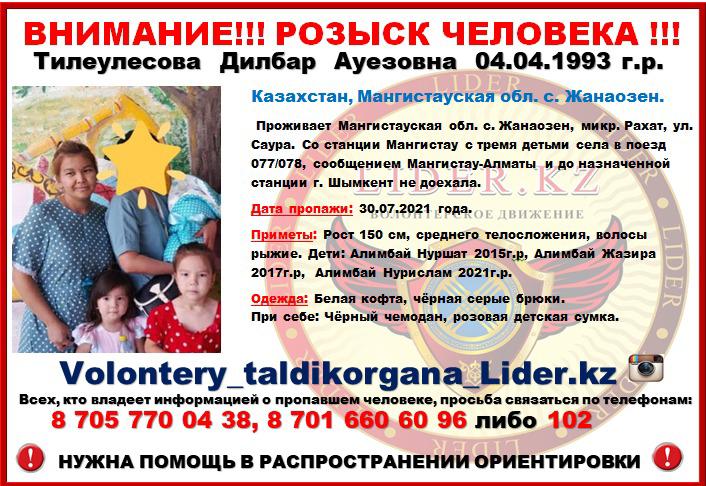 Дилбара Тилеулесова 30 июля с тремя детьми отправилась со станции Мангистау на поезде в Шымкент. Но до назначенной станции не доехала. Об этом сообщили в линейном отделе полиции на станции Мангистау, передает "Лада".